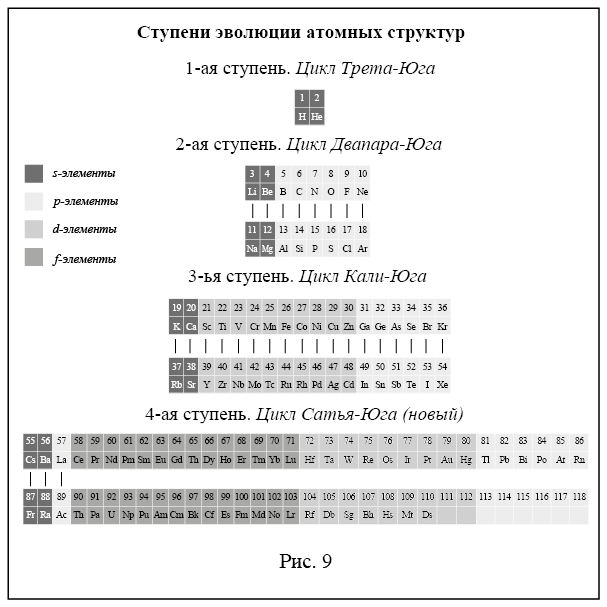 Мы уже предположили, что первыми атомами в цикле Трета-Юга стали первые элементы периодической таблицы Д. И. Менделеева (рис. 9) – это водород и гелий. Это её первая ступень[7]7