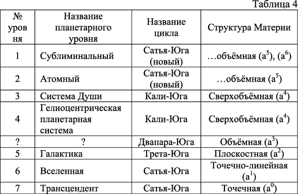Далее возникает нестыковка: галактика имеет явно плоскостной и газообразный характер, что мы и показали в таблице 4. Она, по всей видимости, имеет цикл Трета-Юга с измерением а². Вселенная – это плазменная «планета» – а¹. От галактики в сторону увеличения планетарного уровня у нас получается уже всё правильно, но где-то выпал цикл Двапара-Юга и его объёмное измерение а³. В таблице 4 мы специально оставили пустыми две ячейки, которые и должны содержать в себе нечто, что даёт измерение а³.