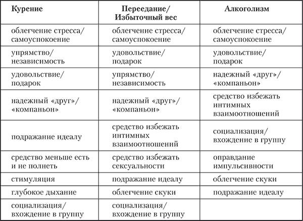 Цитренбаум с соавторами (1998) представили наиболее частые выгоды, даваемые курением, пищевой аддикцией и алкоголизмом, в виде таблицы.