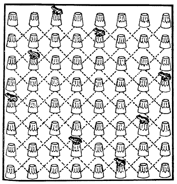 – Что вы думаете вот об этом? – Профессор достал из своих вместительных карманов гротескные и очень яркие фигурки лягушек, улиток, ящериц и других созданий японского производства. Пока мы их разглядывали, он попросил официанта принести 64 бокала. Расставив их на столе в виде квадрата, Профессор положил на бокалы восемь маленьких зеленых лягушек, как показано на рисунке.