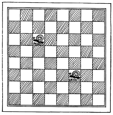 – Нет, это не шахматы. Видите этих двух улиток? Их зовут Ромео и Джульетта. Джульетта стоит на балконе, поджидая своего возлюбленного, но Ромео за ужином напрочь забывает номер ее дома. Квадраты изображают шестьдесят четыре дома, и влюбленный простак должен посетить каждый дом только по одному разу, прежде чем доберется до своей возлюбленной. Помогите ему это сделать с наименьшим числом поворотов. Улитка может двигаться вверх, вниз, поперек доски и вдоль диагоналей. Начертите мелом ее путь.
