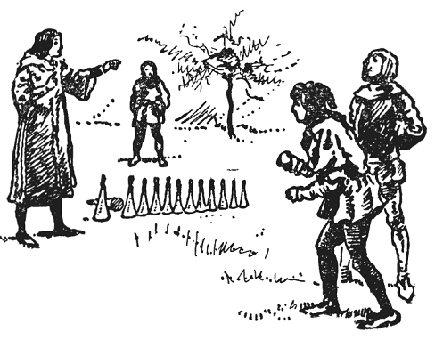 73. Игра в кегли.Почти все наши наиболее популярные игры очень древнего происхождения, хотя во многих случаях они были существенно развиты и улучшены. Игра в кегли (название происходит от французского слова quilles) пользовалась огромной популярностью в четырнадцатом веке и является, несомненно, прародительницей современной игры того же названия. В те времена количество кеглей точно не оговаривалось; им обычно придавалась коническая форма и они выстраивались в ряд.