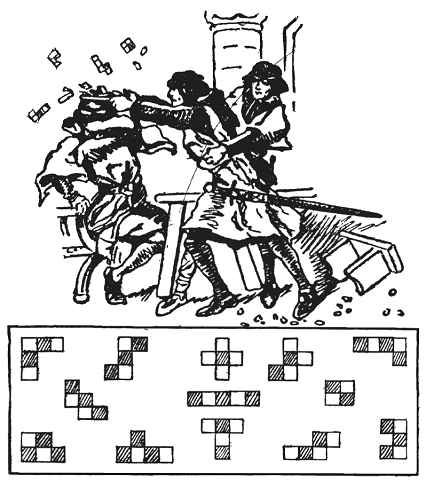 Далее предание гласит (хотя в этой части можно и усомниться), что шахматная доска от удара разломилась на тринадцать частей. На рисунке вы видите их? это двенадцать кусочков разной формы, каждый из которых содержит пять клеток, и только один меньший кусочек состоит из четырех клеток.
