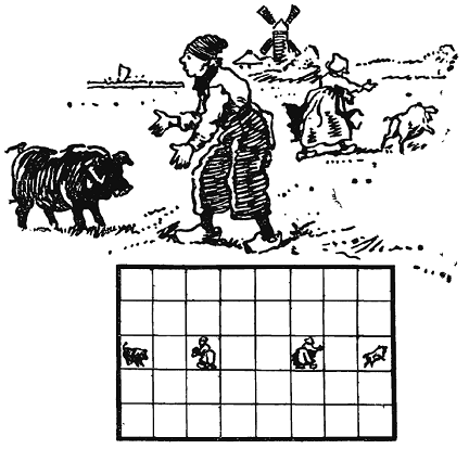 Воспроизведите помещенный здесь чертеж на достаточно большом куске картона или бумаги, а вместо датчанина, его жены и двух свиней используйте четыре фишки. В начале игры фишки следует поместить в указанные квадраты. Один игрок представляет Хендрика и Катрюн, а другой – свиней. Первый игрок передвигает датчанина и его жену на один квадрат каждого в любом направлении, но не по диагонали, а затем второй игрок передвигает обеих свиней тоже на один квадрат каждую, но не по диагонали. Игроки делают это по очереди до тех пор, пока Хендрик не схватит одну свинью, а Катрюн – другую.