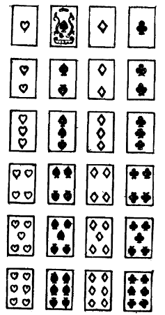 Шулер выкладывает 24 карты, как показано на рисунке, и предлагает ничего не подозревающему пассажиру попытать счастья, определив, кто из них скорее насчитает 31 или заставит противника превысить эту цифру. Делается это следующим образом.