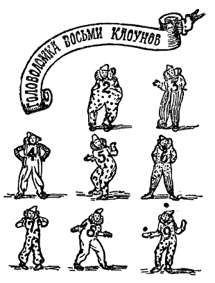81. Восемь клоунов.На рисунке показана группа клоунов, которую мне довелось однажды видеть. У каждого клоуна на костюме было изображено одно из чисел от 1 до 9. После обычных шуток, прибауток и всевозможных кривляний они закончили свое выступление небольшими числовыми трюками. Одним из них было быстрое построение нескольких магических квадратов. Мне пришло в голову, что если бы клоун 1 не появился (что и произошло на рисунке), то этот последний трюк оказалось бы не так-то легко выполнить.