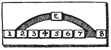 Теперь я предложу читателям новую игру в домашние кегли, в которую можно играть на столе безо всяких предварительных приготовлений. Следует просто расположить в ряд, тесно прижав друг к другу, 13 костяшек домино, шахматных пешек, шашек, монеток, бобов – чего угодно, а затем удалить вторую фигурку, как показано на рисунке.