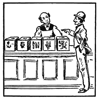 У торговца чаем было пять банок кубической формы, которые стояли в ряд на прилавке, как вы видите на рисунке. Каждая коробка на каждой из шести сторон имела рисунок, так что всего было 30 рисунков. Но один из рисунков первой коробки повторялся на четвертой, адва других рисунка четвертой коробки повторялись на третьей. Следовательно, имелось лишь 27 различных рисунков. Владелец всегда держал первую коробку в одном конце ряда и никогда не ставил бок о бок третью и пятую коробки.