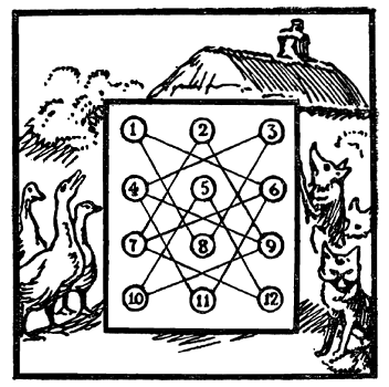 94. Лисы и гуси.Вот небольшая головоломка с фишками, которую читатель, наверное, найдет занимательной. Сделайте диаграмму любого удобного размера, подобную той, что показана на рисунке, и возьмите шесть фишек: три из них изображают лис, а три другие – гусей. Поставьте гусей на кружки 1, 2и 3, а лис – на кружки 10, 11и 12.