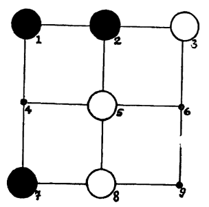 110. Игра Овидия.Изучив «Крестики-нолики», мы рассмотрим теперь, какое развитие может получить эта игра; явно о ней упоминается в одном из произведений Овидия. Это по существу прародительница игры, о которой говорится в пьесе Шекспира «Сон в летнюю ночь» (действие II, сцена 2). У каждого из игроков имеется по три шашки. Они поочередно ставят их на девять позиций, которые вы видите на рисунке, стремясь расположить все свои шашки на прямой и тем самым выиграть партию. Но и после того, как все шесть шашек выставлены, игра продолжается (шашки переставляются всегда на соседнее незанятое место) с той же целью, что и раньше.