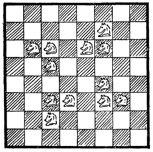 Я показал на рисунке, как можно расположить на шахматной доске 12 коней (наименьшее возможное число), чтобы при этом каждая клетка оказалась либо занятой, либо под угрозой нападения коня. Переберите по очереди все клетки, и вы обнаружите, что дело обстоит именно таким образом. Определите теперь наименьшее число коней, которое требуется, чтобы каждая клетка оказалась либо занятой, либо под ударом, а каждый конь был защищен другим конем. Как следует расставить этих коней? Можно заметить, что из 12 изображенных на рисунке коней лишь 4 защищены подобным образом.