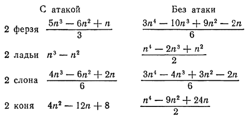 На доске с п 2клетками два ферзя, две ладьи, два слона или два коня всегда можно расположить (безотносительно к тому, атакуют ли они друг друга или нет) (n 4-n 2)/2способами. Следующие формулы показывают, сколькими из способов две фигуры можно расположить при условии взаимной атаки и без нее.