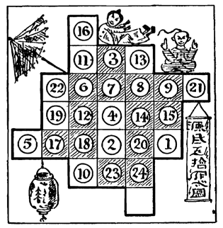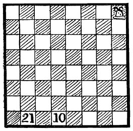 Дабы сделать способ передвижения шашек совершенно ясным, я отмечу, что первый ход конем можно сделать лишь шашками 1, 2или 10.Предположим, что я пошел шашкой 1,тогда следующий ход я должен сделать шашками 23, 4, 8или 21.Поскольку каждый раз свободным оказывается лишь один квадрат, то порядок ходов можно указывать следующим образом: 1 – 21–14 – 18–22и т. д. Чтобы попрактиковаться, вам следует набросать рисунок в большем масштабе, использовав вместо шашек кусочки картона.