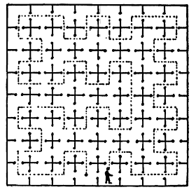 149. Еще одна томящаяся дева.Злой барон в добрые старые времена заточил одну невинную деву в глубокую темницу, которая находилась подо рвом замка. На рисунке вы видите 63 камеры темницы, которые соединены между собой открытыми дверьми, и камеру, где прикована дева. Некий доблестный рыцарь, который любил эту деву, сумел вызволить ее из рук врага. Добравшись до входа в темницу, как показано на рисунке, он затем дошел и до камеры, где томилась дева, посетив по дороге каждую камеру ровно по одному разу. Возьмите карандаш и попытайтесь обозначить его путь. Преуспев в этом, попробуйте свести этот путь к 22 прямолинейным отрезкам. Это можно сделать, по-прежнему не посетив ни одну камеру дважды.