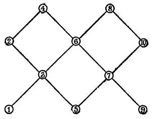 Перерисуйте на листе бумаги в увеличенном виде приведенную здесь схему; затем поставьте 2 белые шашки на кружки 1и 2,а две красные шашки – на кружки 9и 10.Головоломка состоит в том, чтобы поменять белые и красные шашки местами. За один раз вы можете передвинуть любую шашку вдоль любой прямой, соединяющей кружки, с тем единственным ограничением, что красная шашка никогда не должна находиться на одной прямой с белой шашкой. Так, первый ход можно делать лишь с 1-йили 2-йна 3-юлибо с 9-йили 10-йна 7-ю.