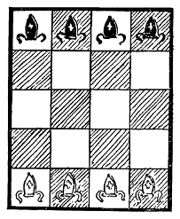 154. Новая головоломка со слонами.Это весьма занимательная маленькая головоломка. Поставьте 8 слонов (4 черных и 4 белых) на уменьшенную шахматную доску, как показано на рисунке. Задача состоит в том, чтобы поменять черных и белых слонов местами, причем ни один слон не должен ни разу атаковать слона противоположного цвета. Они должны ходить по очереди – сначала белый, затем черный, потом снова белый и т. д. Когда вам удастся это сделать, попытайтесь найти наименьшее число ходов.