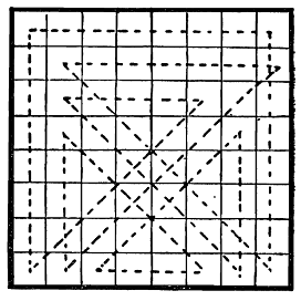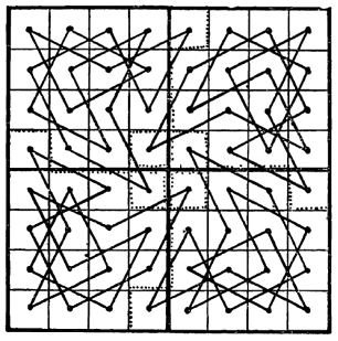 На рисунке вы видите лучшую из попыток такого турне, при которой конь дважды вынужден выйти за пределы своего участка. Попробуйте разбить доску на 4 части одинаковых размеров и формы так, чтобы на каждой из них оказалось возможным осуществить турне коня. Разрезы вдоль пунктирных линий не подходят, ибо тогда 4 центральные клетки оказались бы отделены либо просто висели бы на ниточке.