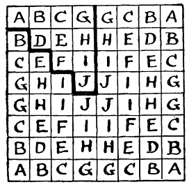 Если вы посмотрите на клетки, отмеченные буквами, то поймете, что на шахматной доске существует только 10 действительно различно расположенных клеток (они очерчены жирной линией), все другие получаются из них с помощью отражений и поворотов. Например, каждое А– угловая клетка, а каждое J– центральная. Следовательно, поскольку указанное решение обладает точкой поворота в очерченной клетке D,мы можем получить решение (начав и кончив в любой клетке, отмеченной буквой D), просто поворачивая доску. Далее, эта схема приведет к турне, начинающемуся из любого A, B, С, D, E, Fили H, тогда как ни один другой известный мне путь не удается приспособить более чем к пяти различным начальным точкам. Не существует турне ферзя в 14 ходов (вспомним, что турне должно заканчиваться в той же клетке, откуда началось), которое начиналось бы с G, Iили J. Но мы можем построить невозвратный путь, проходящий за 14 ходов через всю доску и начинающийся с любой заданной клетки. Отсюда получается следующая головоломка.