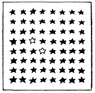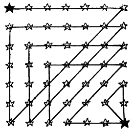 159. Сорок девять звезд. Вданном случае вам нужно просто взять карандаш и, начиная с одной черной звезды, вычеркнуть все звезды за 12 прямолинейных движений, закончив вычеркивание на другой черной звезде. Можно заметить, что на рисунке это сделано за 15 движений. Каждое изменение направления должно происходить на какой-нибудь звезде, а прямые обязаны быть параллельными сторонам и диагоналям квадрата, как показано на рисунке.