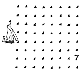 Наше состязание состоит в том, чтобы, начав от буя, где дрейфует на рисунке яхта, коснуться каждого из 64 буев за 14 прямых курсов и возвратиться в конце маршрута к бую, от которого начали плавание. Седьмой курс должен закончиться у буя, на котором развевается флажок.