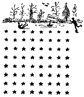 158. Занятный конькобежец.Вы видите на рисунке 64 звездочки, отмеченные на льду конькобежцем, который собирается, начав с того места, где он сейчас стоит,проехаться по каждой из них, прочертив 14 прямолинейных участков пути. Как он сможет это сделать? Разумеется, нет никаких возражений против того, чтобы он проезжал через любую точку более одного раза, однако последний прямолинейный участок пути должен привести его к месту старта.