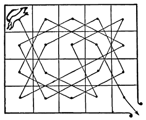 163. Головоломка с борзой. Вэтой головоломке речь идет о 20 конурах, которые отделены друг от друга низкой стенкой. Единственным их обитателем является борзая, которая живет в левом верхнем углу. Когда ее выпускают погулять, то на свободу она должна выбираться не иначе, как побывав в каждой конуре ровно по одному разу и сделав серию ходов коня, чтобы выскочить в правом нижнем углу, где находится выход. Линиями на рисунке показано одно из решений.