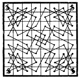 Святой Георгий хочет поразить дракона. Как известно, уничтожение драконов было его обычным времяпровождением, а поскольку он делал это верхом на коне, то, естественно, ему хотелось бы добиться своего, сделав серию ходов конем. Можете ли вы показать, как, начиная с центральной клетки, он сумеет посетить каждую клетку ровно один раз, проделав непрерывную цепочку ходов конем, в конце которой, на своем последнем ходу, он доберется до дракона? Разумеется, перед ним большое разнообразие путей, так что попытайтесь найти тот, который выглядел бы покрасивее, когда вы отметите каждый ход прямой линией, идущей из одной клетки в другую.