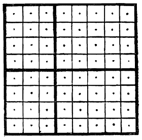 Так вот, капитан говорит, что если смелый лев пересечет ваш путь в пустыне, то ситуация становится острой, ибо лев обычно выслеживает человека так же, как и человек охотится за царем зверей. И когда они встречаются, между ними всегда происходит схватка. Некоторое размышление по поводу этой несчастной и искони длящейся кровной вражды навело меня на мысль подсчитать вероятность встречи человека со львом. Во всех подобных случаях приходится начинать с некоторых более или менее произвольных допущений, вот почему, подумалось мне, окажется полезным рисунок, на котором вы видите строго регулярные дорожки в пустыне. Хотя капитан уверяет меня, что пути львов обычно весьма близки к такому расположению, я в этом сильно сомневаюсь.
