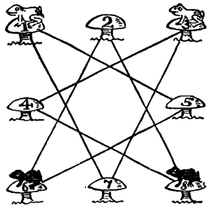 Головоломка состоит в том, чтобы, передвигая за один раз по одной лягушке в любом порядке вдоль прямых линий от одного грибка до другого, поменять лягушек местами, то есть черные лягушки должны занять грибки 1и 3, а белые – 6и 8.Воспользовавшись четырьмя шашками и приведенной схемой, вы найдете эту задачу совсем простой, но несколько труднее будет сделать это за 7 перемещений, где любое число последовательных ходов одной лягушки считается одним перемещением. Разумеется, на одном грибке одновременно может сидеть лишь одна лягушка.
