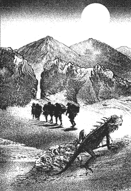 Упродовж цього нескінченного дня, терплячи нелюдські муки і ледве волочачи ноги, ми поволі просувалися вперед, долаючи не більше як півтори милі за годину. Коли сонце сіло, ми зробили привал і в очікуванні сходу місяця трохи подрімали, заздалегідь випивши кілька ковтків води. Перш ніж лягти, Амбопа вказав нам на невеликий пагорб, контури якого ледь мріли на гладенькій поверхні піщаної рівнини на відстані близько восьми миль від нашої стоянки. Здалеку він був схожий на мурашник, і я дивувався, що це могло бути.