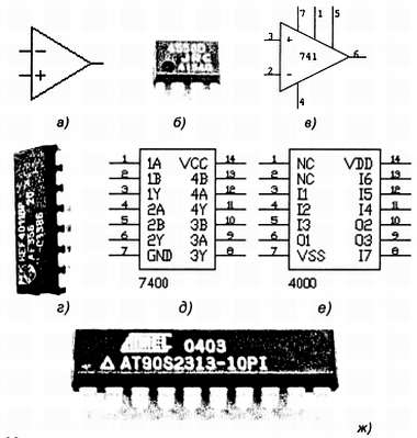 Цифровые микросхемы работают с логическими сигналами, имеющими два разрешенных уровня напряжения. Каждая микросхема преобразует последовательность входных сигналов в последовательность выходных. В связи с этим микросхема, заключенная в тот или иной корпус, имеет следующие выводы («ножки»): питания (общий – «земля» и напряжения питания (+5 В или +3,3 В), входы внешних цифровых сигналов и выходы. Большинство микросхем заключено в DIP-корпус с двумя рядами, содержащими от 8 до 40 выводов по продольным боковым сторонам (см. рис. 16, г-е).