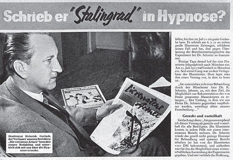 Симпатии привлеченных к делу врачей явно на стороне Герлаха. Спустя два месяца после первых сообщений о тяжбе между Карлом Шмитцем и Генрихом Герлахом журнал Frankfurter Illustrierte вернулся к этой теме, опубликовав обстоятельное расследование: “Он написал «Сталинград» под гипнозом?”[158]158