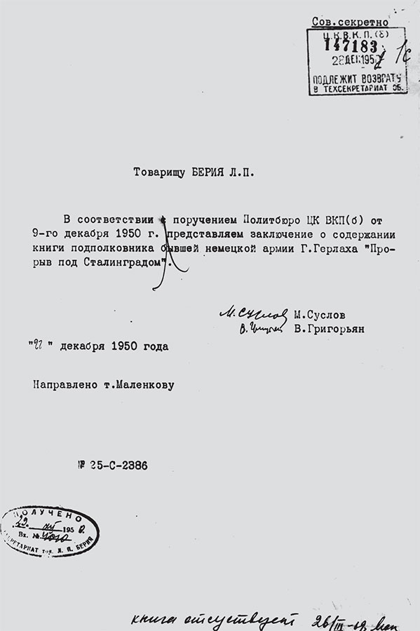 В соответствии с поручением Политбюро ЦК ВКП(б) от 9-го декабря 1950 г. представляем заключение о содержании книги подполковника [так!] бывшей немецкой армии Г. Герлаха “Прорыв под Сталинградом”[302]302
