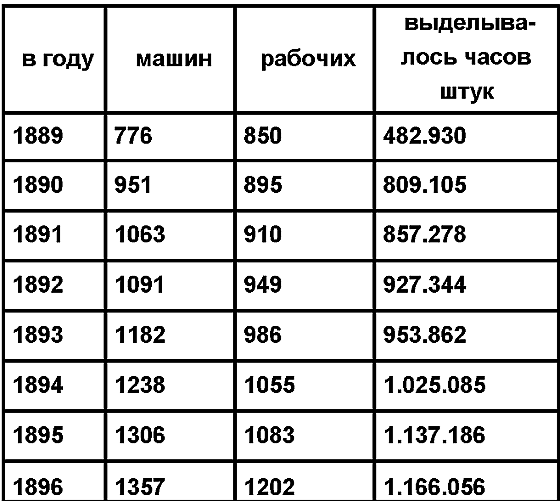 Фабрикация часов в самом широком масштабе, кроме Шварцвальда, имеет еще своим местопребыванием вюртембергский городок Шрамберг. Здесь образцово устроенная фабрика выделывает всякого рода часы по американской системе. В ней современная крупная фабрикация самого последнего времени доведена до наиболее полного своего развития. Основание этой фабрики относится к началу пятидесятых годов 19-го столетия. Оно было осуществлено человеком, родившимся в хижине поденного рабочего – Эргардом Юнгганс. По окончании местной школы, он поступил рабочим на фабрику, где работал его отец Прилежание и знание дела помогли ему выдвинуться и достичь крупных материальных успехов. Он решил изготовлять часы по американской системе и для этой цели обратился к своему брату, который жил в Америке уже пятнадцать лет: он просил прислать ему модели часов и машин и приехать к нему в Шрамберг. Вначале часовое производство развивалось очень медленно, но потом разрослось и перед смертью Эргарда Юнгганса достигло таких размеров, что в состоянии было конкурировать с американскими фирмами. Для своих рабочих Эргард Юнгганс был старшим товарищем; он хорошо их понимал, так как сам вышел из их среды. После смерти основателя фирмы, его сын Артур продолжал вести дело своего отца вместе с его братьями. Из года в год производство росло, и с 1889 года цифра, выражающая количество выработки приблизительно утроилась. Тогда же была установлена наряду с возросшей тем временем до 150 лошадиных сил водяной энергией (турбиной) паровая машина в 250 лошадиных сил. Рядом с ней в настоящее время работает паровая машина в 800 лошадиных сил. В такой же пропорции возрастало также, как видно из последующей таблицы число машин и рабочих.