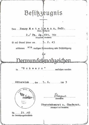 Свидетельство о награждении меня Черным знаком за ранения. Более серьезные и многочисленные раны «поощрялись» более престижными Серебряным и Золотым знаками.