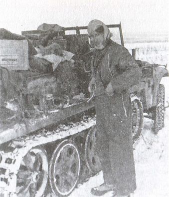 В первую военную зиму у нас не было специальной одежды для холодного климата. В конце 1942 года (я тогда водил тягач, таскавший противотанковую пушку) эта ошибка была исправлена. Этот камуфлированный костюм надевался поверх униформы. С изнанки он был выкрашен в белый цвет. Некоторым из нас повезло, и они получили теплые сапоги.