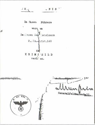 Все, что осталось от моего свидетельства о награждении «Именем фюрера» «Крымским щитом». Документ подписан факсимиле генерал-фельдмаршала Эриха фон Манштейна.