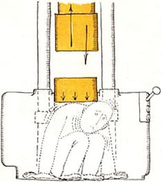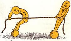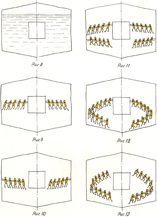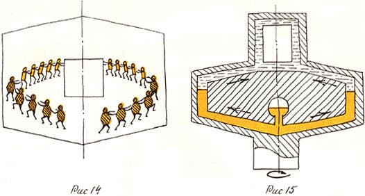 Применим метод ММЧ. Физическое противоречие: по условиям задачи «человечки-жидкость» должны давить на изделие (рис. 9), а по законам физики они обязаны давить в противоположную сторону (рис. 10). Будем действовать по обычной нашей логике: совместим несовместимое. Пусть одновременно происходят два противоположных действия (рис. 11). К сожалению, человечки давят только на стенки; давления на изделие нет. Значит, давление на стенки надо «перевернуть» (рис. 12). Но как это сделать? Если мы столкнем одну шеренгу человечков с другой, давление просто нейтрализуется (рис. 13). Как при соревнованиях по перетягиванию каната, когда силы команд равны… Впрочем, ничто не мешает нам поставить в нижнюю шеренгу более сильных (более массивных) человечков (рис. 14). Вот и ответ! Пусть в сосуде будут две разные жидкости, например ртуть и масло (рис. 15). При вращении сосуда давление ртути пересилит давление масла и заставит масло давить на изделие. Красивое решение казалось бы совершенно нерешимой задачи…