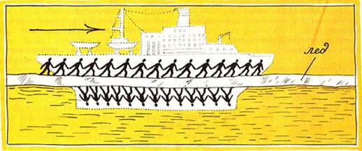 Кстати, «штуковина» и в самом деле оказалась непохожей на ледокол. Представьте себе корпус корабля, у которого вырезан средний слой, – тот слой, который находится на уровне льда. Или, скажем, десятиэтажный дом, у которого нет седьмого этажа. Корпус крупного ледокола как раз имеет высоту с десятиэтажный дом. Если одного этажа нет, лед (его толщина два-три метра) свободно пройдет сквозь отсутствующий этаж. И корабль сможет двигаться, не ломая лед.