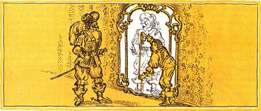 Интересно, что первым идею этого приема высказал Александр Дюма, автор «Трех мушкетеров». В романе «Десять лет спустя» есть глава о том, как Портос заказывал новый костюм. Портос не соглашался, чтобы к нему прикасались, снимая мерку. Выход нашел драматург Мольер, оказавшийся в приемной портного. Мольер подвел Портоса к зеркалу и снял мерку с изображения мушкетера…