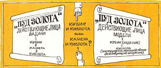 В ситуации и задаче речь идет о реальных технических системах, а в модели задачи мысленно выделяются две части системы. В воздухе висит расплавленный шлак, а над ним – столб холодного воздуха. Вот и вся модель! Домны, железнодорожные платформы, даже ковши – все это не попадает в модель. Остаются только две конфликтующие части, и это уже огромный шаг вперед. Ведь вместе с другими частями мы отбрасываем множество «пустых» вариантов, которые пришлось бы рассмотреть.