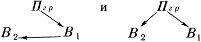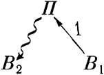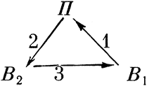 Попробуем и мы решить эту задачу. Сначала запишем условия. Собака В1 создавала акустическое поле П (обозначим это стрелкой 1). Поле действовало на охотника В2 (стрелка 2). Охотник шел к собаке (стрелка 3).