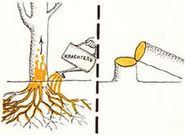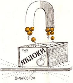 В задаче 24 об укладке фруктов надо использовать правило разрушения веполей: между двумя сталкивающимися плодами должно находиться третье вещество, похожее на плод. Например, мягкий шарик. Бросим в коробку десятка два таких шариков, они будут смягчать удары. Коробка установлена на вибрирующем столе, поэтому легкие шарики всегда находятся в верхнем слое, отважно принимая на себя удары падающих плодов.