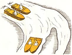 Задачу 18 о катамаране нетрудно решить, если вы вспомните, что технические системы на третьем этапе развития становятся перестраивающимися, динамичными, меняющимися. Изобретатель Е. И. Лапин получил авторское свидетельство № 524 728 на катамаран, корпуса которого соединены подвижными стойками и могут при необходимости сближаться. На таком катамаране легче проходить узкие речные шлюзы.