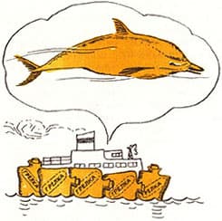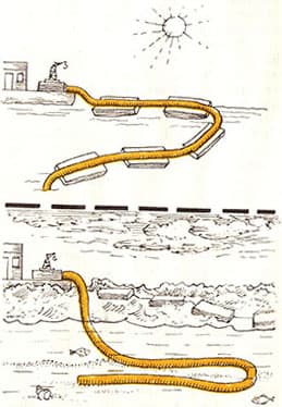 Сходное решение и у задачи 21 о земснаряде. Трубопровод должен стать динамичным, подвижным. В хорошую погоду он будет держаться наверху, у понтонов. А в плохую – опустится вниз. На поверхности останутся только понтоны, волны не причинят им вреда.