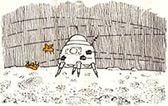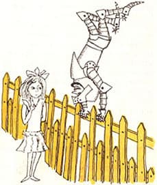 – Вот как я до этого додумался, – продолжал Рыцарь. – Понимаешь, я рассуждал так: основная трудность в ногах – как поднять их наверх. Голова и так наверху! Значит так: сначала кладем голову на забор – голова, значит, уже наверху. Потом становимся на голову – тогда и ноги тоже наверху, правда? И перемахиваем через забор! Ну, что ты скажешь?»