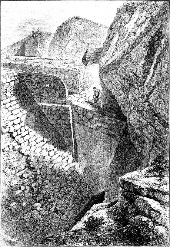 Когда мои архитекторы тщательно раскопали в 1882 году пространство перед пещерой, а также саму пещеру и три узких прохода, мы обнаружили, что проходы, которые поворачивают к востоку и юго-востоку, имеют примерно такую же длину, что и большой проход, а именно 18 метров, однако тот проход, что поворачивает к северу, несколько короче; что в конце каждого из этих проходов находится источник, вода из него вытекает в большую галерею и в римские времена ее отвели с помощью глиняной трубы. Однако поскольку во многих местах эта труба оказалась разбитой, мои сотрудники и я в 1879 году ее даже не заметили и сочли, что вода вытекала через открытую канавку в полу в глиняную трубу, которую мы нашли снаружи. Однако теперь, вполне тщательно очистив большой проход от всей земли и грязи, которая все еще была там, под глиняной трубой в природной почве мы открыли весьма примитивный водопровод, построенный из необработанных известковых камней, выложенных без какого-либо связующего материала и покрытых подобными же плитами, который простирался по всей длине большого прохода и его северного ответвления. Он весьма похож на циклопический водопровод, обнаруженный мною в Тиринфе и Микенах (см. мои «Микены», с. 9, 80, 141). Этот канал был заполнен глиной и грязью, и возможно, так было еще с глубокой древности.