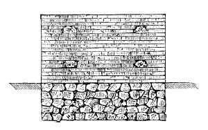 Чтобы сделать эту стену из высушенных на солнце кирпичей более прочной, ее искусственным образом обожгли прямо на месте, с помощью сильного огня, который зажгли на ее западной стороне. На восточной стороне из-за крутого склона то же самое сделать было нельзя. Стену нельзя было обжечь насквозь из-за ее значительной толщины, поскольку жар не мог проникнуть внутрь. Чтобы добиться этого, во внутренней части стены на разной высоте были проделаны канавки высотой и толщиной 0,3 метра, устройство которых можно видеть на рис. 16. Однако стену, разумеется, нельзя было обжечь таким образом равномерно по всей толщине: кирпичи вдоль канавок сплошь обожжены, в то время как кирпичи на восточной стороне совершенно сырые и необожженные. На многих кирпичах можно наблюдать отдельно различные стадии обжига: в то время как часть их, повернутая к канавке, была обожжена полностью, часть, повернутая в другую сторону, носит лишь легкие следы обжига или вообще никаких. Весьма интересно прослеживать действие огня по канавкам. Доктор Дерпфельд заметил вдоль канавки сначала круг, который был раскален полностью и докрасна и теперь окрашен в светлый цвет; за ним идет черное кольцо, которое получило свою окраску от черного дыма. Еще дальше от канавки кирпичи полностью обожжены и окрашены в красный цвет: соединения, которые состояли из другого материала, светло-красные. Чем дальше кирпичи отстоят от канавки, тем менее красный у них цвет и тем меньше в них проник обжиг. В менее обожженной или плохо обожженной части стены ракушки, содержавшиеся в кирпичах, сохранили свой белый цвет, в то время как в местах, которые были обожжены полностью, они почернели от огня. С обеих сторон стена имеет глиняное покрытие толщиной 1 миллиметр. Весьма вероятно, что кирпичная стена второго города была по всей длине построена подобным же образом; однако это, конечно, первый когда– либо найденный образец стены цитадели, которая была построена из необожженных кирпичей и обожжена прямо на месте.