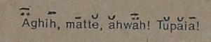 Тот же друг, которому я обязан приведенными выше замечаниями, слышал также траурную или похоронную песню о смерти Тупайи. Обитатели залива Толога в северной части Новой Зеландии, особенно ценившие Тупайю, сымпровизировали эту песню, когда команда «Адвенчера» сообщила им о смерти сего таитянина. Слова крайне примитивные, но, судя по всему, звучали они ритмично и располагались так, что их медлительное движение выражало чувство скорби.