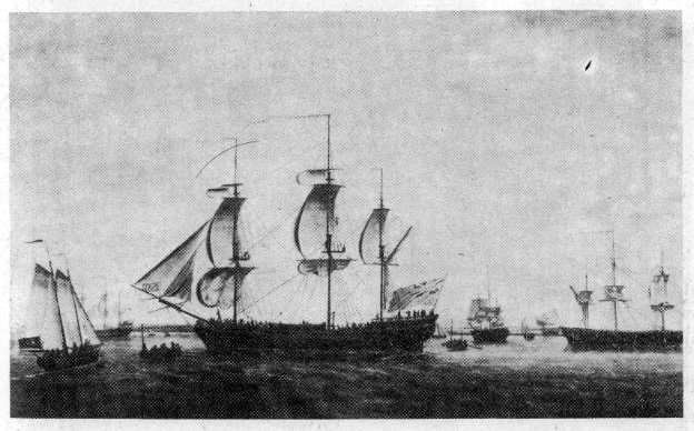 Шлюп «Резолюши» (в центре) на рейде Портсмута. С картины Ф. Холмена